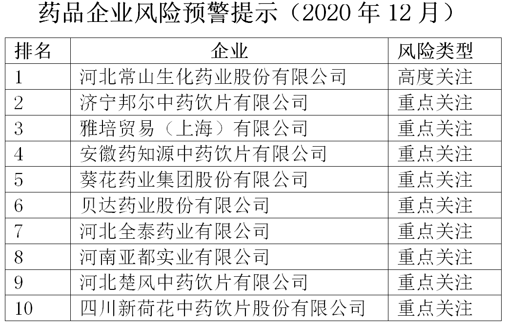 近日,中國(guó)健康傳媒集團(tuán)輿情監(jiān)測(cè)中心發(fā)布藥品企業(yè)風(fēng)險(xiǎn)預(yù)警提示(2020年12月),公開風(fēng)險(xiǎn)指數(shù)排名前十的企業(yè)。河北常山生化藥業(yè)股份有限公司(以下簡(jiǎn)稱常山藥業(yè))排名第一,為“高度關(guān)注企業(yè)”;濟(jì)寧邦爾中藥飲片有限公司、雅培貿(mào)易(上海)有限公司、安徽藥知源中藥飲片有限公司、葵花藥業(yè)集團(tuán)股份有限公司、貝達(dá)藥業(yè)股份有限公司、河北全泰藥業(yè)有限公司、河南亞都實(shí)業(yè)有限公司、河北楚風(fēng)中藥飲片有限公司、四川新荷花中藥飲片股份有限公司分列第2至10位,為“重點(diǎn)關(guān)注企業(yè)”。