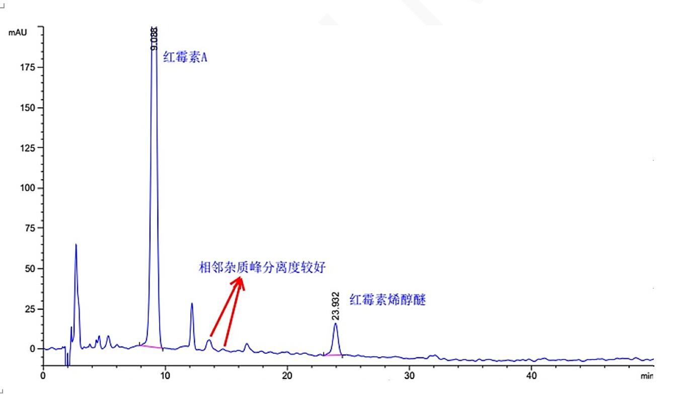 注:該方法要求紅霉素 A 峰與紅霉素烯醇醚峰的分離度應大于 14.0,紅霉素 A 峰的拖尾因子應小于 2.0。Titank C18 色譜柱分離度可達 20.19,拖尾因子 0.912,且對一些相鄰雜質(zhì)峰有更好的分離效果。