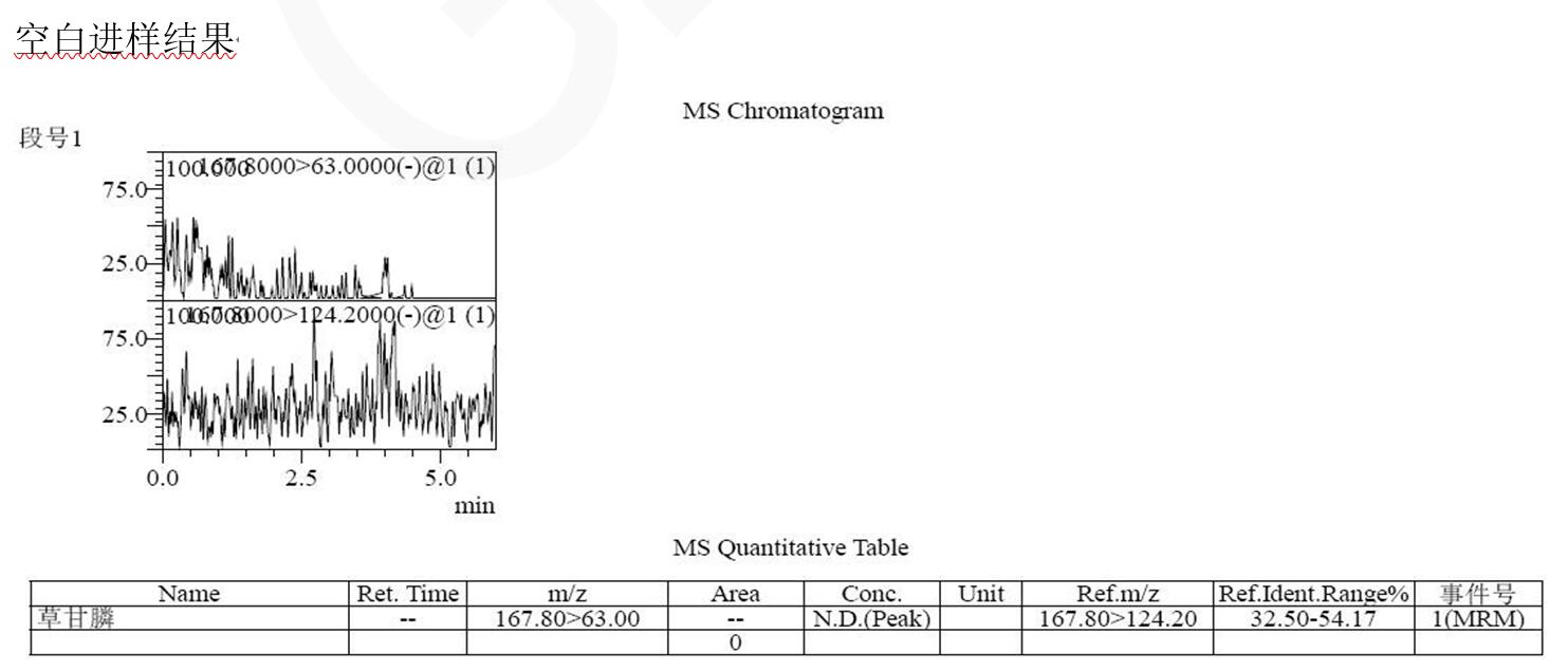 說明:本方法研究草甘膦不衍生直接檢測(cè)。相比于傳統(tǒng)衍生后用 C18 分析,或者用氨基柱不衍生 PH=10-11 條件下分析,帶來的復(fù)雜,耗時(shí),以及氨基柱結(jié)果重現(xiàn)與壽命上的問題。此方法簡(jiǎn)單,快速,方便。可滿足常規(guī)分析檢測(cè)需求以及多數(shù)殘留檢測(cè)需求。