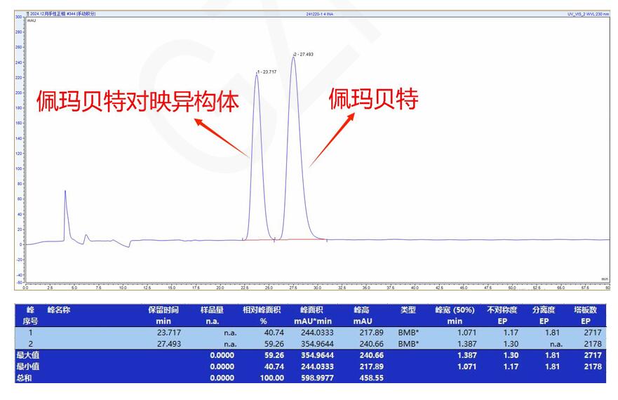 App ID: FLM-B250001 佩瑪貝特及其對映異構體的手性拆分 方法 1: 色譜柱:Chiral INA 5μm 250*4.6mm (貨號:FMG-JY5-I01) 流動相:正相(咨詢) 流速:0.8 mL/min 檢測波長:230nm 柱溫:25℃ 樣品濃度:1mg/ml 稀釋劑:甲醇 進樣量:10ul 色譜圖: