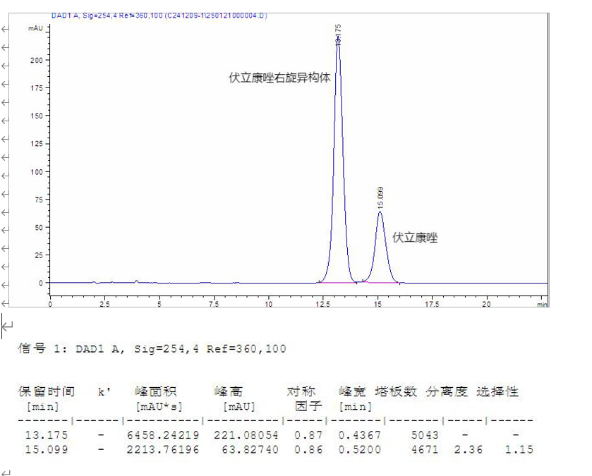App ID: FLM-B250003 伏立康唑及對(duì)映異構(gòu)體的手性拆分 色譜柱:Chiral INC 5um 150*4.6mm (貨號(hào):FMF-JY5-I03) 流速:1 mL/min 檢測(cè):UV254nm, 25oC 樣品濃度:2mg/mL 進(jìn)樣量:10 μ 溶劑:水 流動(dòng)相:反相(咨詢) 色譜圖: