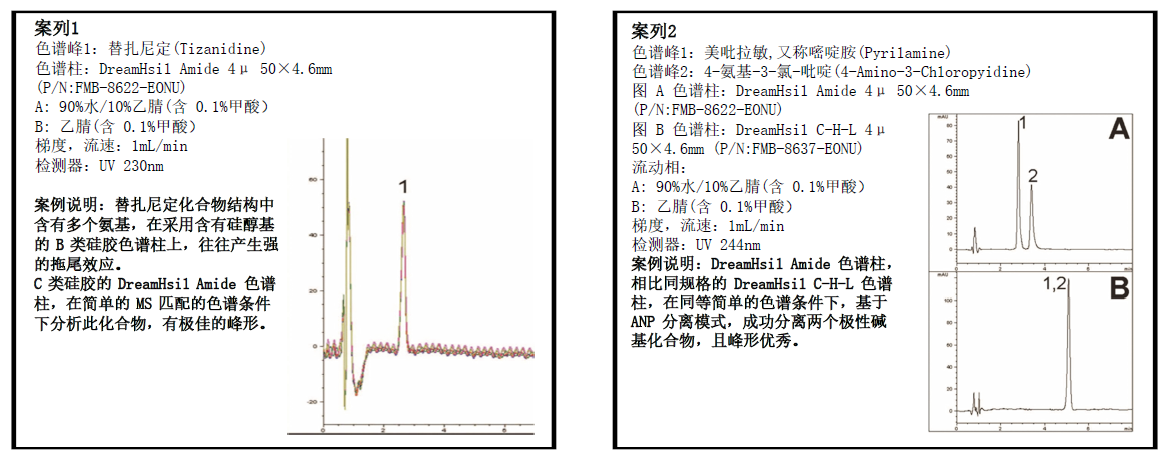 ANP分離模式是此固定相的主要分離模式。保留大極性物質(zhì)的同時,也保留疏水物質(zhì)。對于易拖尾的堿性化合物峰型優(yōu)秀。