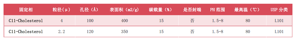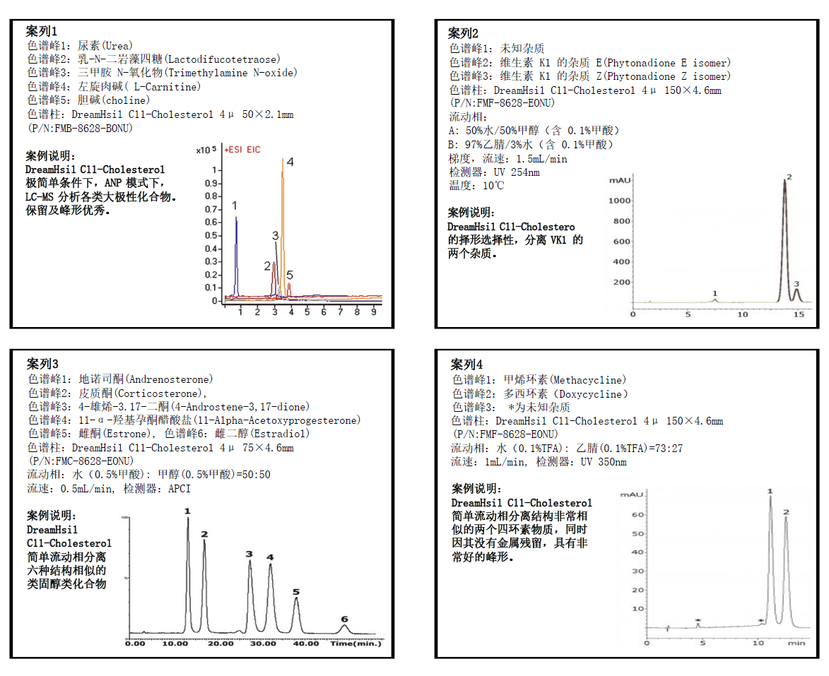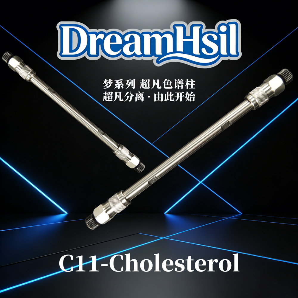 • DreamHsil C11-Cholesterol 色譜柱 C11-Cholesterol具有非常獨特的選擇性。采用獨特鍵合技術,將固定相直接獨立的單點鍵合于Si-H鍵上直接形成Si-C鍵的C11-Cholesterol鍵合相。