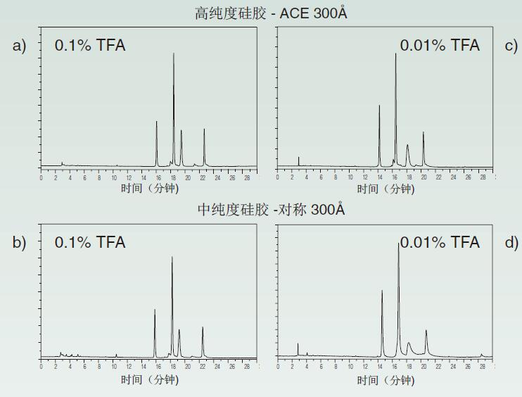 0.1%TFA與(a)高純度(b)中純度硅膠柱;0.01%TFA與(c)高純度和(d)中純度硅膠柱。