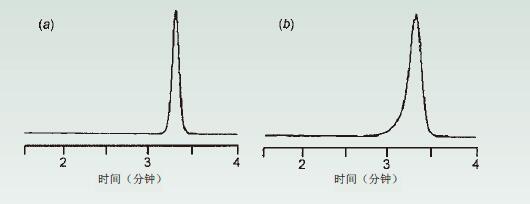 改變柱并未糾正這個問題(更換色譜柱不能解決此問題),所以玻璃料(篩板)堵塞并非導(dǎo)致這一現(xiàn)象的原因。如果柱上樣品的質(zhì)量減少(減少上樣量)(圖4b),峰形看起來更像是兩個峰,而不是一個肩形峰。